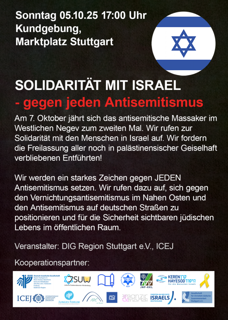 am Sonntag, den 5. Oktober rufen die DIG Stuttgart und ICEJ zu einer Großkundgebung auf dem Marktplatz auf.
