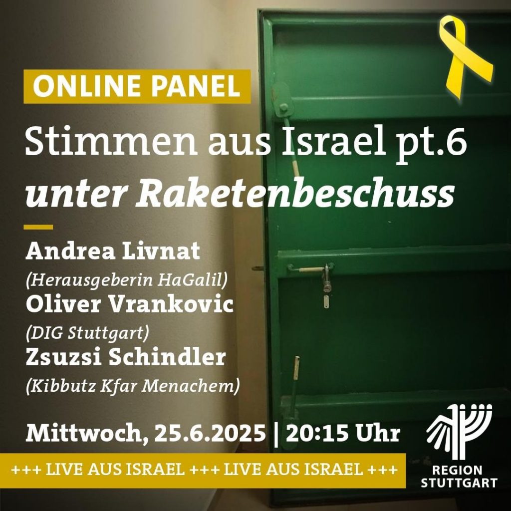 Die DIG Stuttgart bedankt sich bei Zsuzsi Schindler und Andrea Livnat für die Einblicke in den israelischen Alltag unter Raketenbeschuss aus dem Iran. Im sechsten Panel „Stimmen aus Israel“, zum dem auch unser Vorsitzender Oliver Vrankovic gehörte und der von Susanne Wetterich (DIG Stuttgart) moderiert wurde, könnte den 90 Teilnehmer*innen ein authentischer Eindruck in die verschiedenen Aspekte des Kriegsalltag vermittelt werden, angefangen vom Umgang mit der ständigen Lebensgefahr durch den Raketenbeschuss bis zu den kriegsbedingten Einschränkungen.
